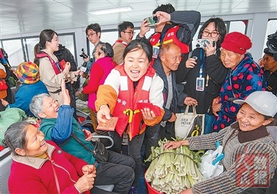 “秦船长,莫舍不得啦,等开上新船,你就轻松多了。”挑着一背篓蚕豆、油麦菜和鹅蛋,菜农何玉梅踏着跳板,招呼秦大益上新船。她身后跟着几名坐船的乡亲。