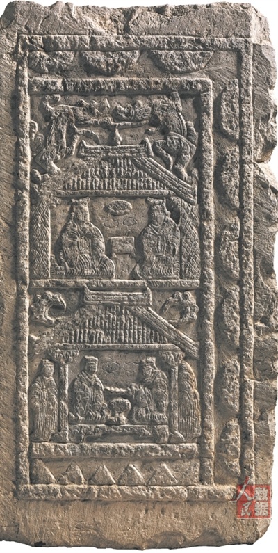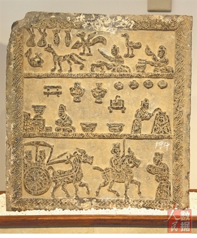 现藏于徐州博物馆的东汉时期汉画像石《宴饮图》。 |