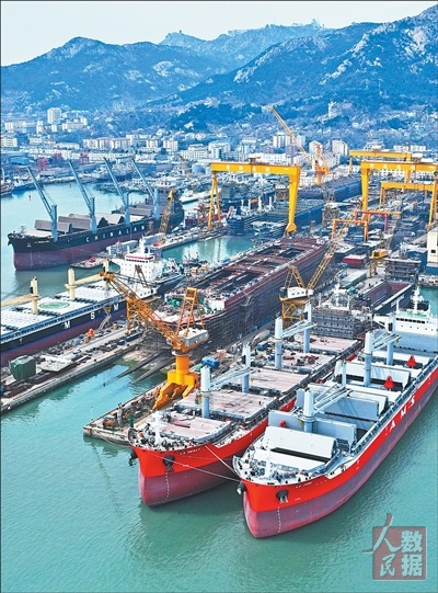 近来,山东省荣成市持续优化海洋装备产业生态,推动修造船业从传统制造向高端化、绿色化、智能化转型。图为3月31日,荣成市石岛管理区造船基地停泊着正在建造的各类大型船舶。