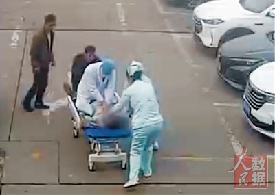 随后,一位路过的陌生人也伸出援手,众人合力将李成抬上抢救车。两名护士和李成的工友推着抢救车往急诊室转运,樊传武跪在抢救车上,继续无间断对李成进行胸外按压,为后续救治抢出宝贵时间。