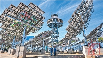 四川攀枝花市西区多面体钛酸锶聚光制氢(加氢)一体站中试基地,分布着144台定日镜,从不同方向将阳光反射到中央聚光反射塔上的24个制氢反应器里。经过聚光催化反应,水被分解成氢气和氧气,氢气经过冷却脱水被存储到加氢站的储罐里。攀枝花年均日照约2700小时,为光解水制氢提供了充足的太阳能。