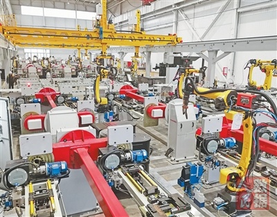 生产“新同事” 在湖南浏阳市一生产基地内,由交通银行授信支持的长沙华恒机器人系统有限公司自研生产的工业机器人正在作业。 苏卓钰摄(人民视觉) |