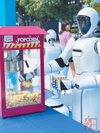 商业“新伙伴” 在广东佛山市一园区内,美的人形机器人“美拉”操作爆米花机,为园区员工提供服务。 李彩畅摄(人民视觉) |