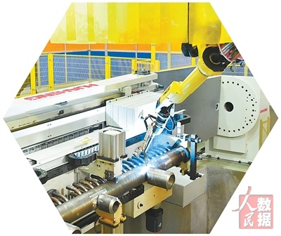 生产“新同事” 浙江嘉兴经开区城南街道一家企业,机器人正在焊接马鞍形钢管构件。机器人的使用提升了生产效率,降低了人工焊接风险。 张 琦摄(人民视觉) |