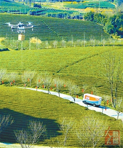 “中国茶海”贵州湄潭县,春茶寄递开启“空地联乘”新模式。无人机沿既定轨迹精准起降,将鲜茶从山头空运至山脚;无人车无缝衔接至加工包装厂,快速转运至各大城市。