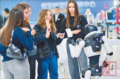 日前,意大利雷卡纳蒂市的青少年到访江苏苏州人工智能产业园,近距离感受中国科技活力。图为意大利青少年与中国人形机器人互动。