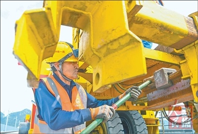 工人在渝万高铁铺轨工程建设现场施工作业。