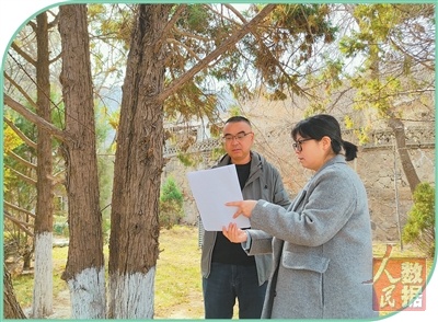 巨舜庆(左)在向工作人员了解树木长势和养护情况。 |