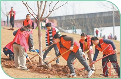 园林志愿者在湖北宜昌市伍家岗区柏临河畔栽种樱花树树苗。 |