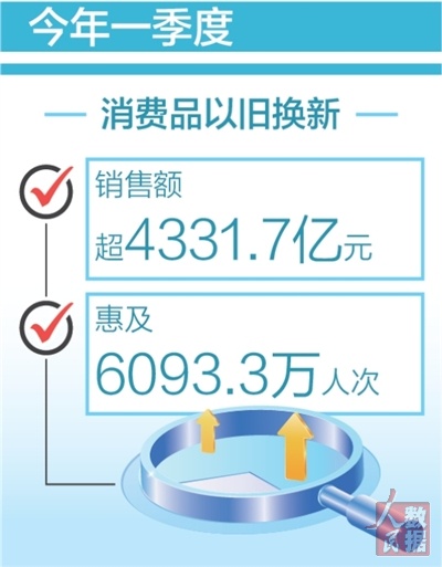 本报北京4月5日电 (记者王珂)记者从商务部获悉:今年一季度,消费品以旧换新销售额超4331.7亿元,惠及6093.3万人次。