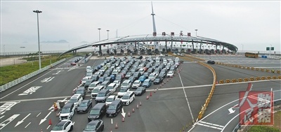 港珠澳大桥上,大批车辆正通过珠海公路口岸入境。 |