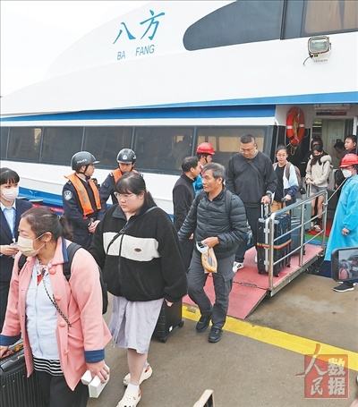 4月3日,在福建泉金客运码头,旅客走出泉金“小三通”客运航线“八方”轮。近日,很多台胞通过连接泉州和金门的泉金“小三通”客运航线来到福建寻根踏青,泉金客运码头迎来清明节两岸人员往来高峰。 |