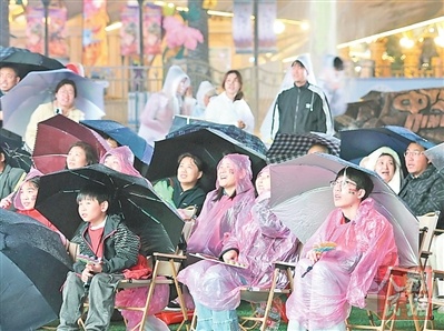 4月11日,2026江苏省城市足球联赛(“苏超”)揭幕战举行,吸引众多市民游客观赛。图为观众在常州市迪诺水镇冒雨观看比赛直播。 刘臻睿摄(新华社发)