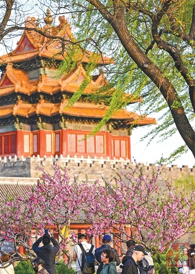 4月11日,游人在北京故宫西北角楼附近打卡拍照。时下,各地春花烂漫,人们走出家门赏花游园,享受美好春光。 新华社记者 陈晔华摄