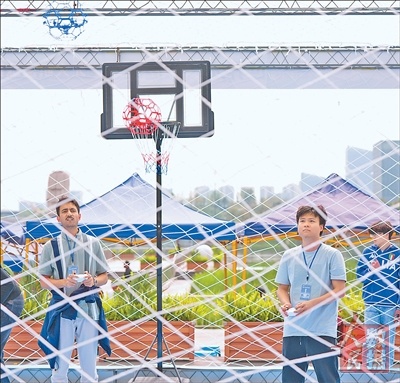 图为参赛选手在无人机篮球比赛前试飞。