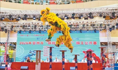 4月12日,广西壮族自治区贺州市举行狮王公开赛,比赛设传统南狮与高桩南狮两大组别,共16支队伍参赛,在铿锵欢快的锣鼓声中喜迎传统节日“三月三”。图为4月12日,贺州市缤纷环球城,高桩南狮比赛进行中。