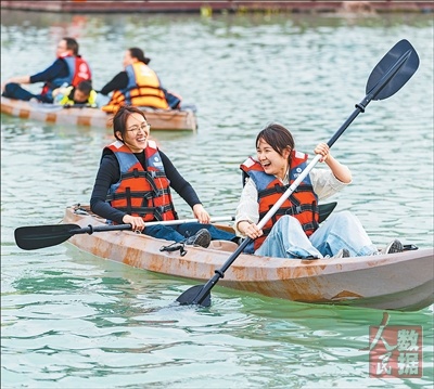 近年来,山西省运城市加大对五龙峪河道的生态修复和景观提升力度,构建起河畅、水清、岸绿、景美的生态廊道。图为4月11日,市民在五龙峪生态休闲区游玩。