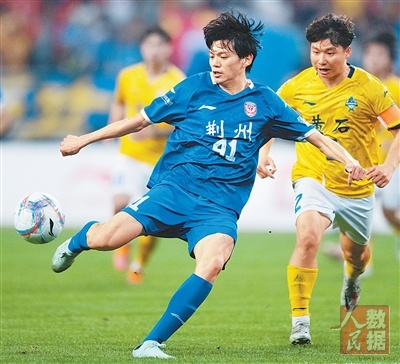 4月12日,“楚超”第一轮比赛中,荆州恒隆队球员(左)在比赛中射门。 新华社记者 伍志尊摄