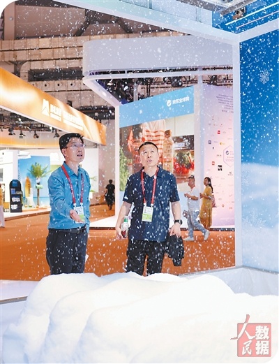 往前走,一股凉意扑面。在华发集团展位,只见一座迷你冰雪世界——玻璃罩内,造雪机嗡嗡作响;伸出手,水汽凝结的冰晶落在掌心,丝丝凉意透入皮肤。