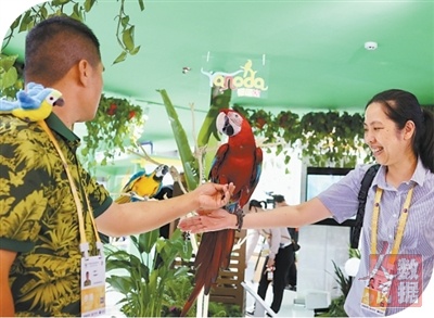 参展人员在消博会时尚潮流展区与鹦鹉互动。 |