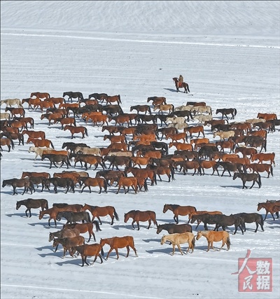 日前,甘肃山丹马场春耕大幕全面拉开,为保障农耕生产顺利开展,牧马人有序组织马群撤离农作物茬地,引导马群分批重返天然草原。图为牧马人组织马群转场。