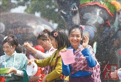 每年4月13日至15日是泰国传统新年宋干节。图为在泰国大城府,人们与大象互相“泼水”,迎接宋干节。