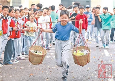 4月15日,浙江省湖州市德清县禹越镇高桥中心小学,学生参加校园趣味运动会的扁担挑粮赛。滚蚕匾赛、扁担挑粮赛、蔬菜接力跑、赶小鸡等比赛项目“农”味十足,孩子们尽享运动的乐趣。