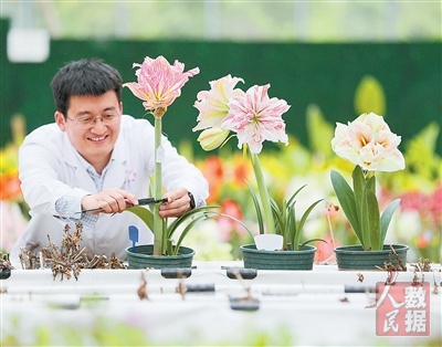 智能温室大棚里,科研人员精心管护自主培育的朱顶红新品种。