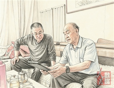 退休语文教师国立朗(右一)与家人交流电子产品使用方法,AI修饰生成素描画 |