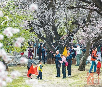 图为游客在乌素图杏花谷游玩。