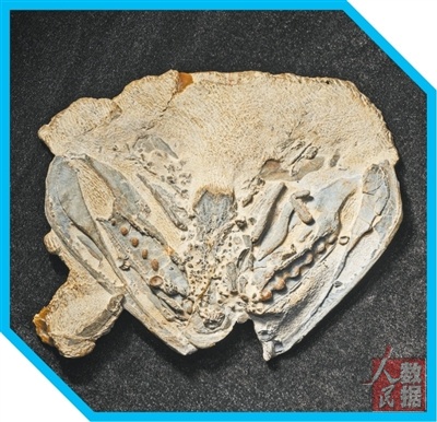 钝齿宏颌鱼化石,发现于云南曲靖志留纪晚期(约4.23亿年前)地层中,全长1米有余,是当时最大的鱼类。从完整的头颅化石中可以看到,嘴里交错长着小帽状的“齿垫”,上面密布小牙。 |