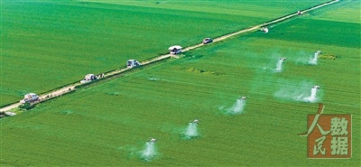 河南驻马店西平县张尧村的高标准农田示范区,多架无人机在麦田进行“一喷三防”作业。 赵永涛摄(影像中国)