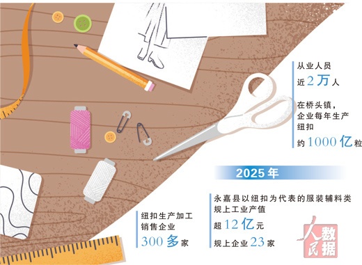 2025年,永嘉县以纽扣为代表的服装辅料类规上工业产值超12亿元,规上企业23家,纽扣生产加工销售企业300多家,从业人员近2万人。在桥头镇,企业每年大约生产纽扣1000亿粒。