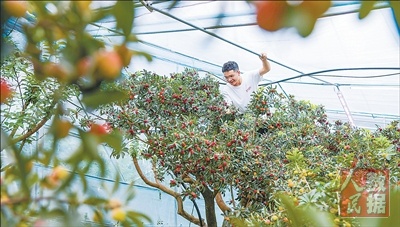 近期,浙江慈溪首批大棚杨梅成熟上市。当地引进全自动双膜光水肥增温等技术,精准模拟自然生长环境,延长杨梅上市周期,助力增收致富。图为4月21日,慈溪匡堰镇戚源杨梅专业合作社的负责人在双膜大棚内查看杨梅的成熟度。